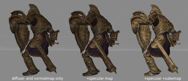 The environment map shader is also quite common. It provides a method of simulating reflectivity by using a prerendered environment texture as the reflection. This is applied additively to the mesh. It is commonly used for metals, ore, and ice. Shapes using the environment map shader should have diffuse, combined normal/specular, environment, and environment mask textures. The environment mask texture is used to define how strongly the cubemap is blended per texel. If no environment mask is assigned, the shader falls back on the specular map as a mask. The environment map shader is incompatible with glow mapping, so if you have a mesh for which you want to use both effects, you have to split it into parts, or overlay a partially transparent mesh.